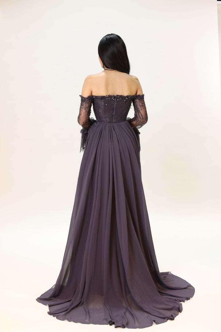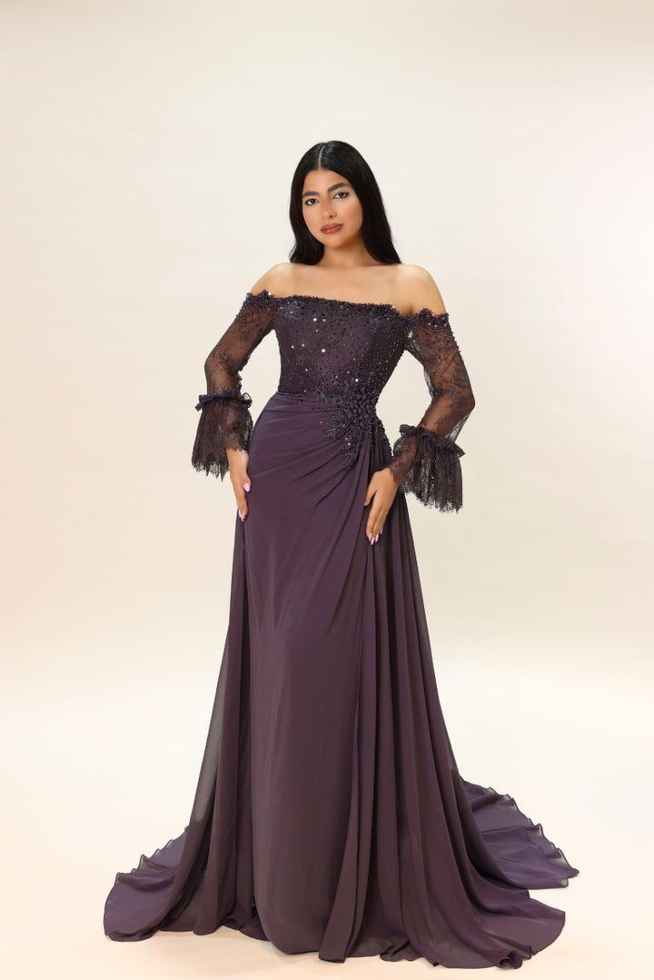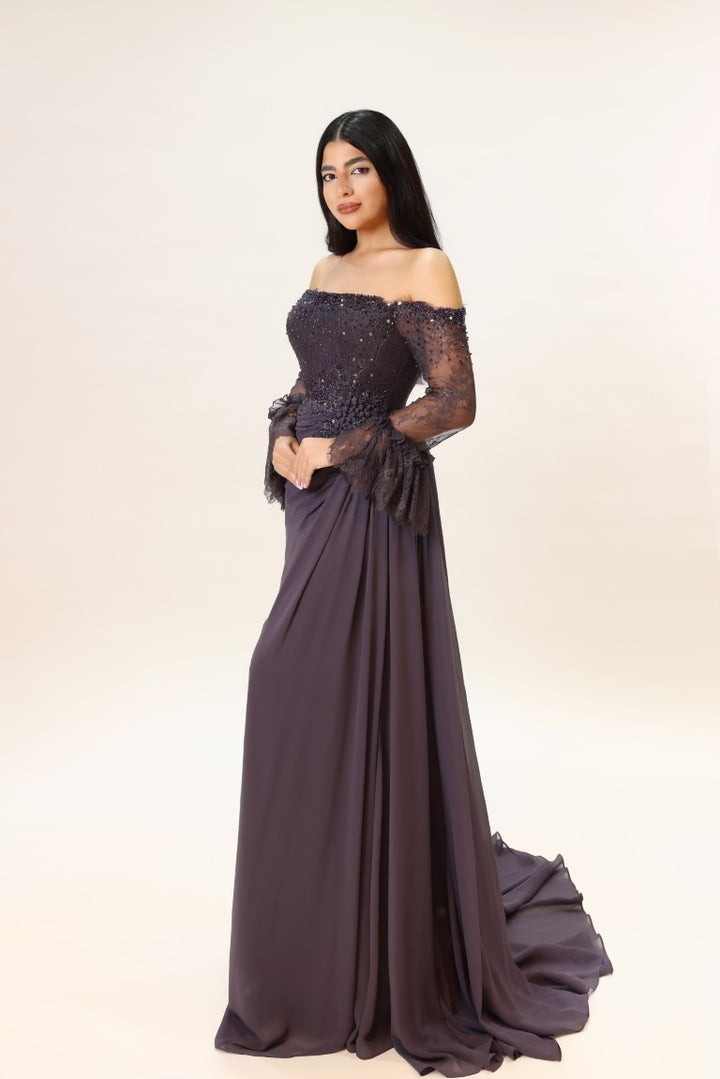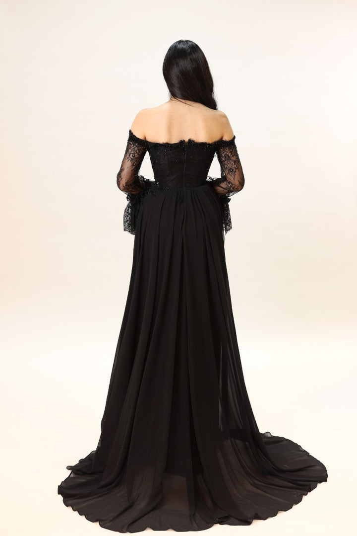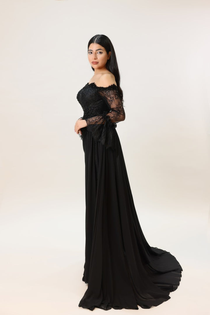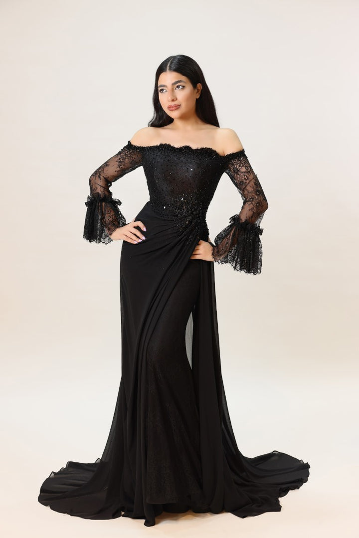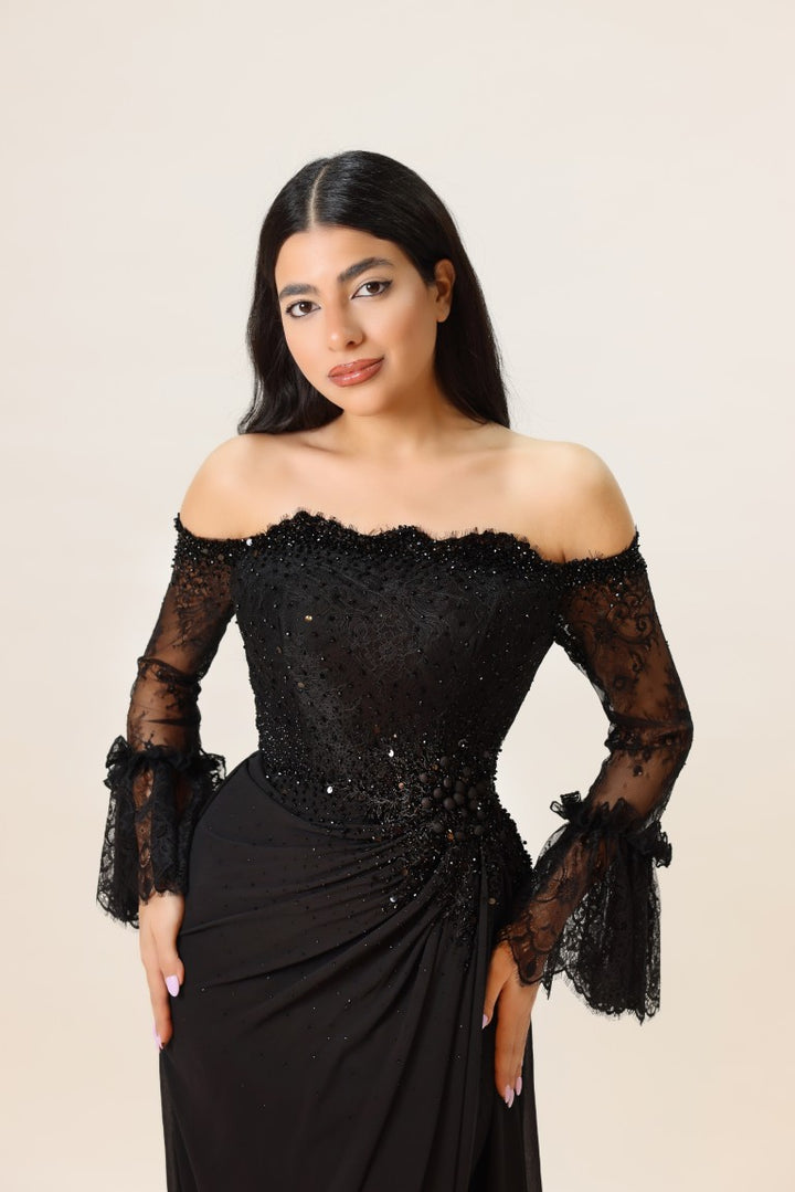 The off-shoulder neckline frames the shoulders with subtle allure, while the bodice glistens with delicate beadwork and sequin embellishments that evoke a celestial shimmer. Sheer lace sleeves with flared cuffs add a vintage romantic touch, perfectly balancing grace and drama. The softly draped skirt flows to the floor, creating a silhouette that moves with both strength and serenity.
