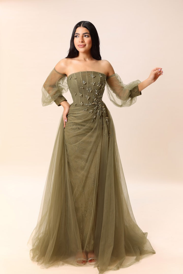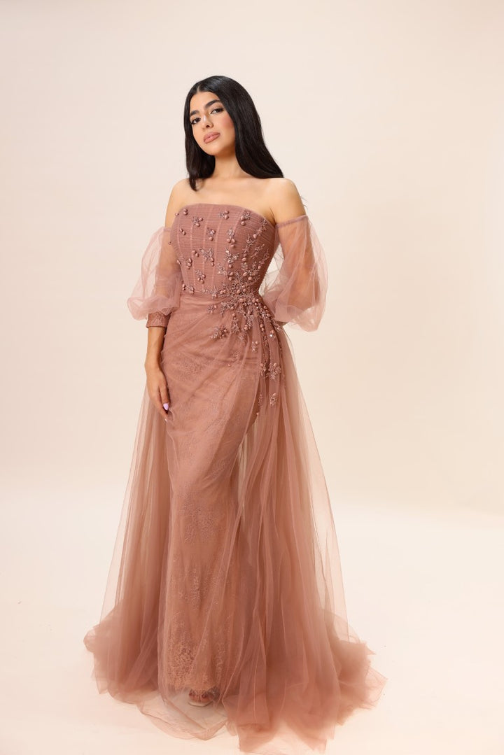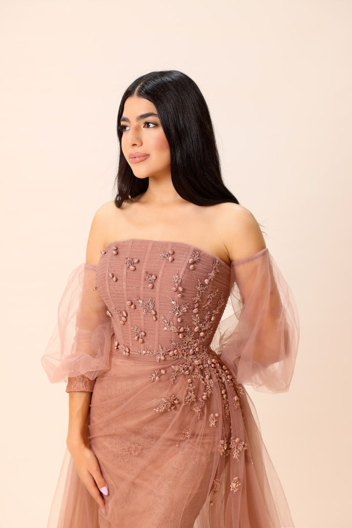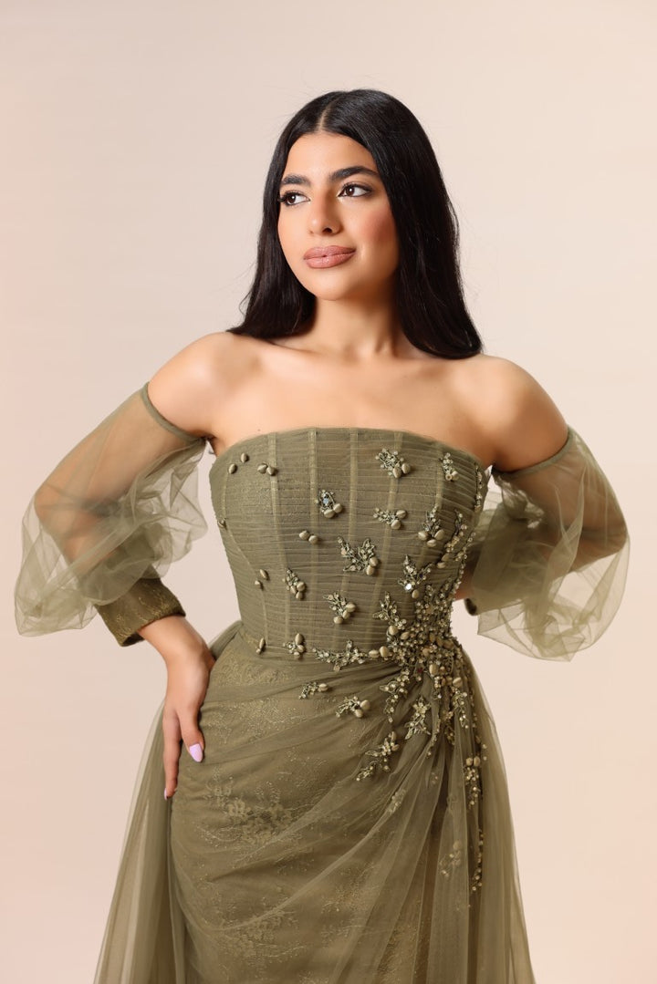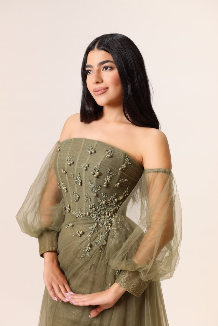 The gown features delicate hand-applied embellishments across the bodice, adding dimension and refinement without overpowering its romantic simplicity. Sheer puff sleeves offer a dreamy, couture-inspired touch, while the draped overlay creates graceful depth.