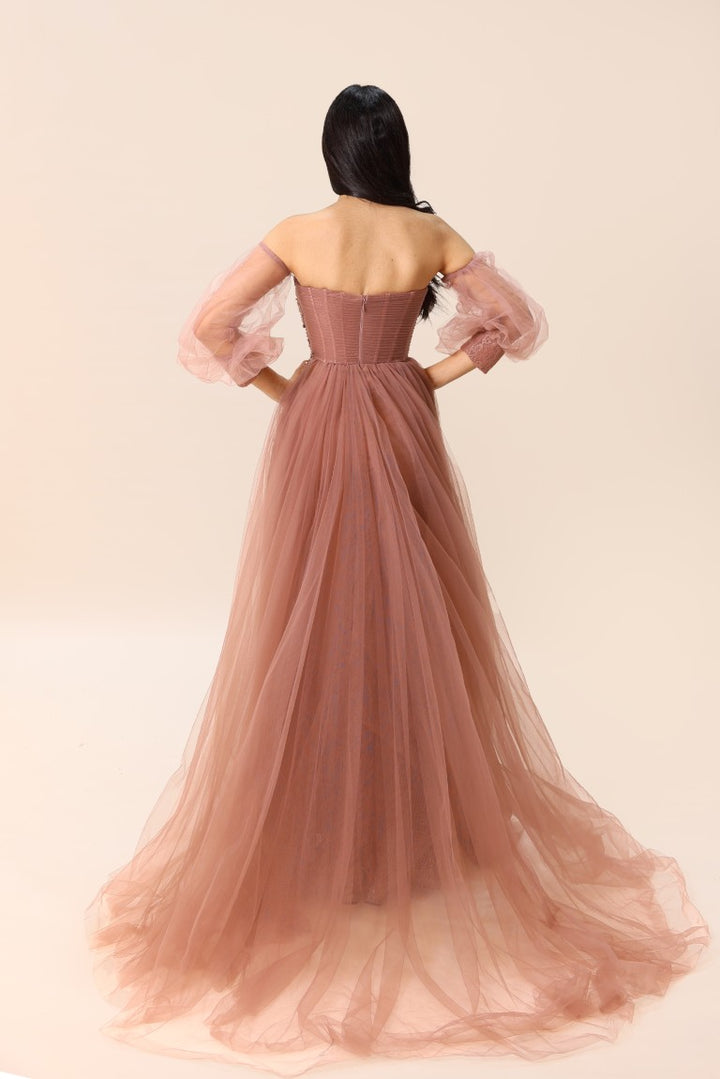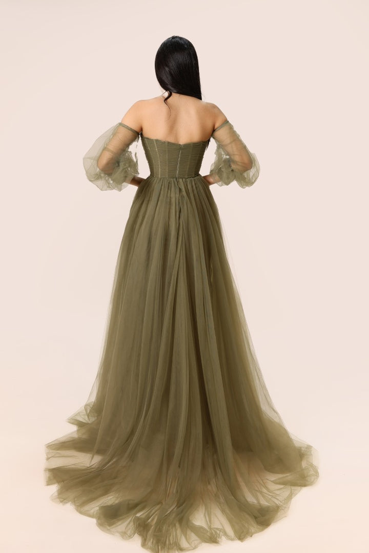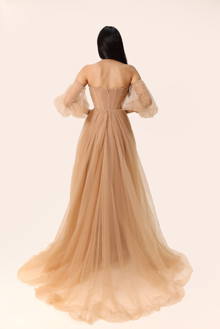- Sheer puff tulle sleeves for a soft, ethereal finish