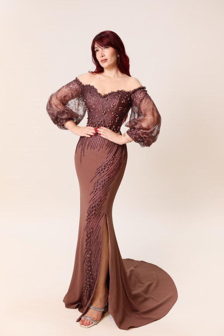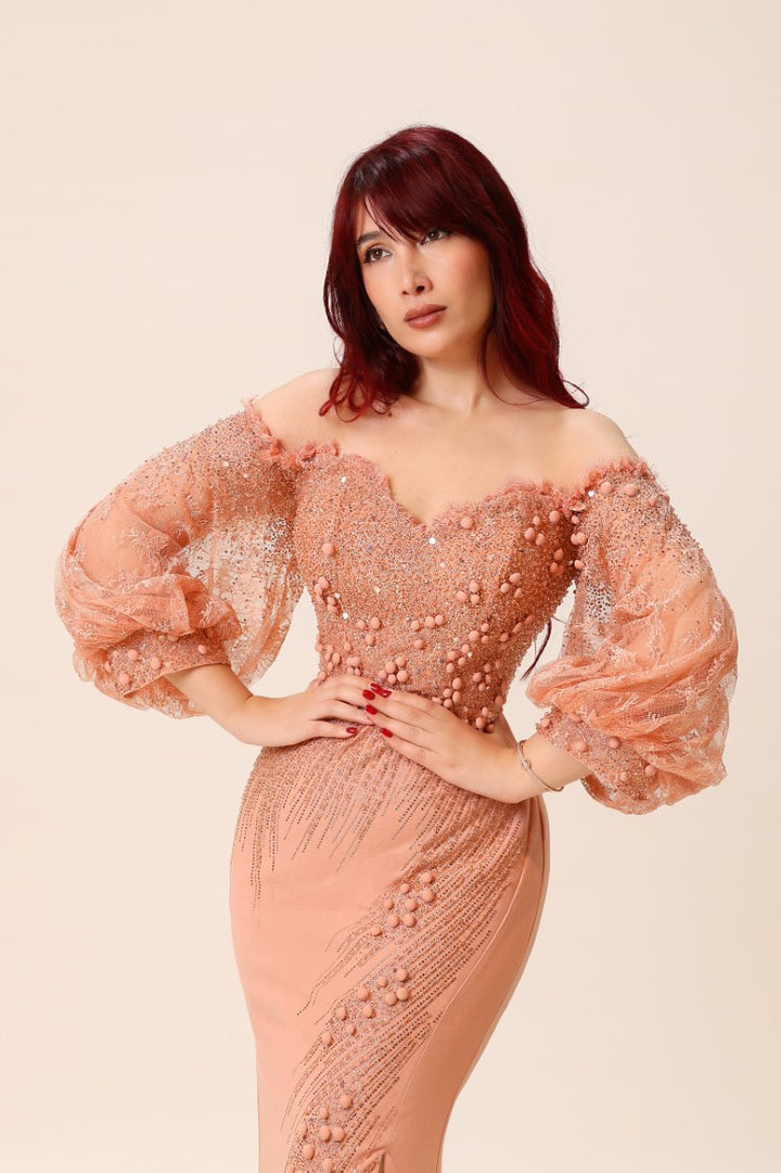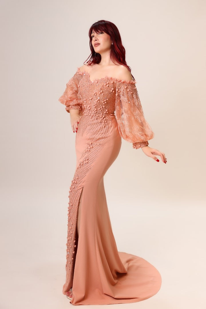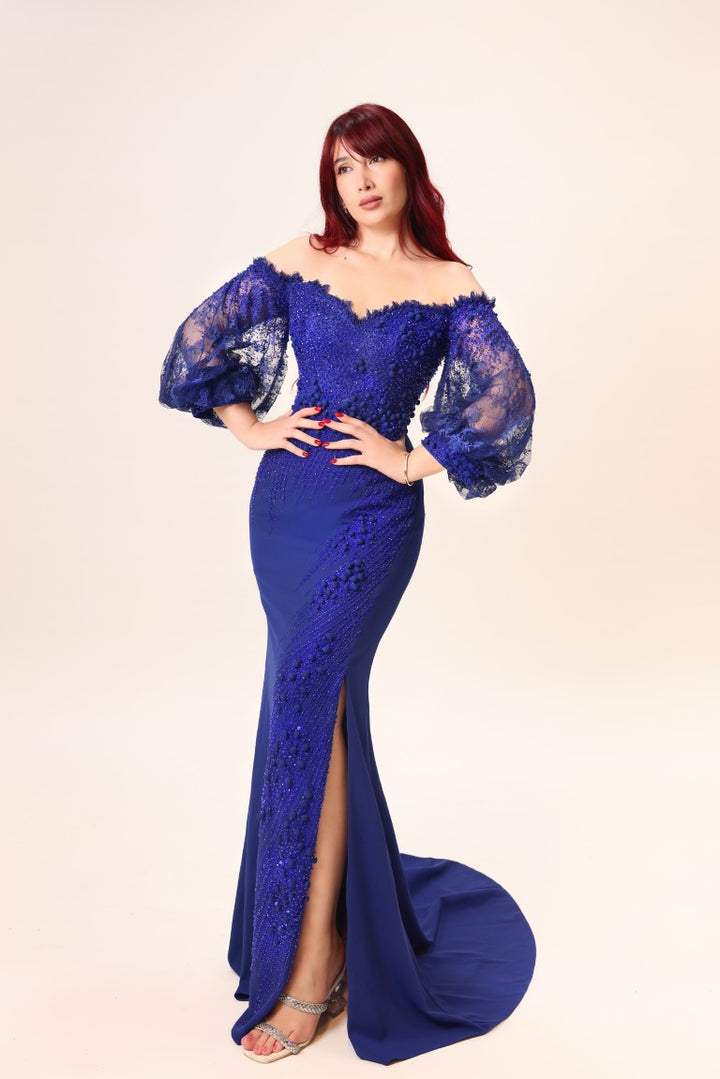 The off-shoulder neckline frames the collarbone with refined elegance, while the meticulously hand-embellished bodice and sheer voluminous sleeves evoke couture grandeur. A structured mermaid fit highlights the waist and hips before cascading into a graceful floor-length hem with a front slit — balancing poise and sensuality with perfect harmony.