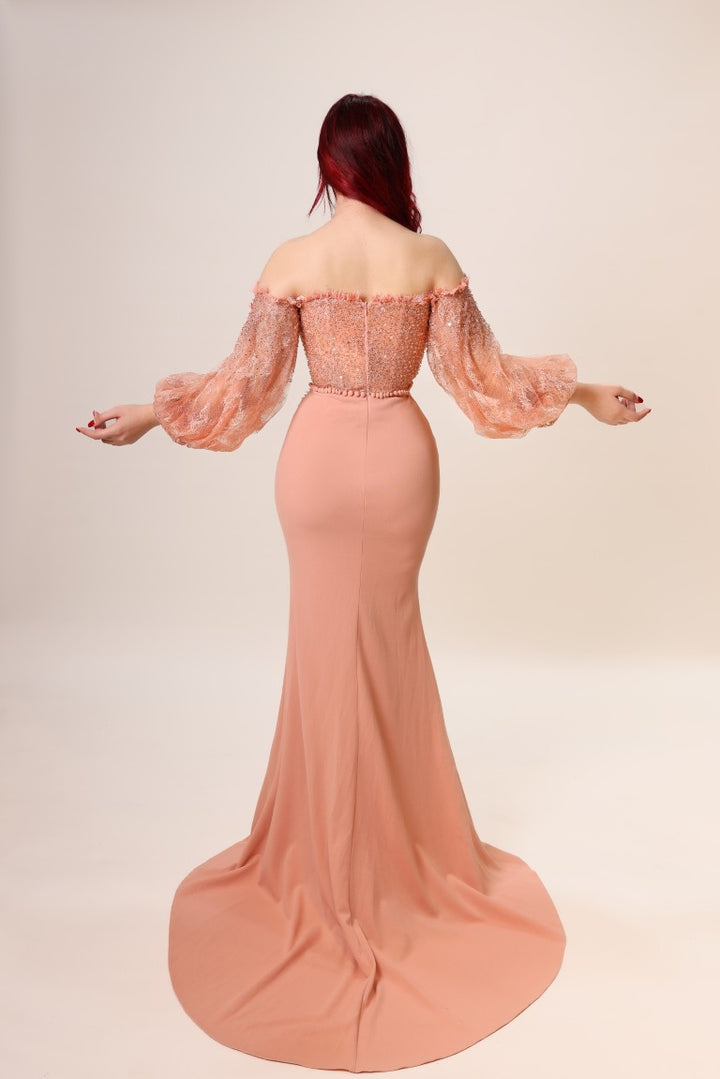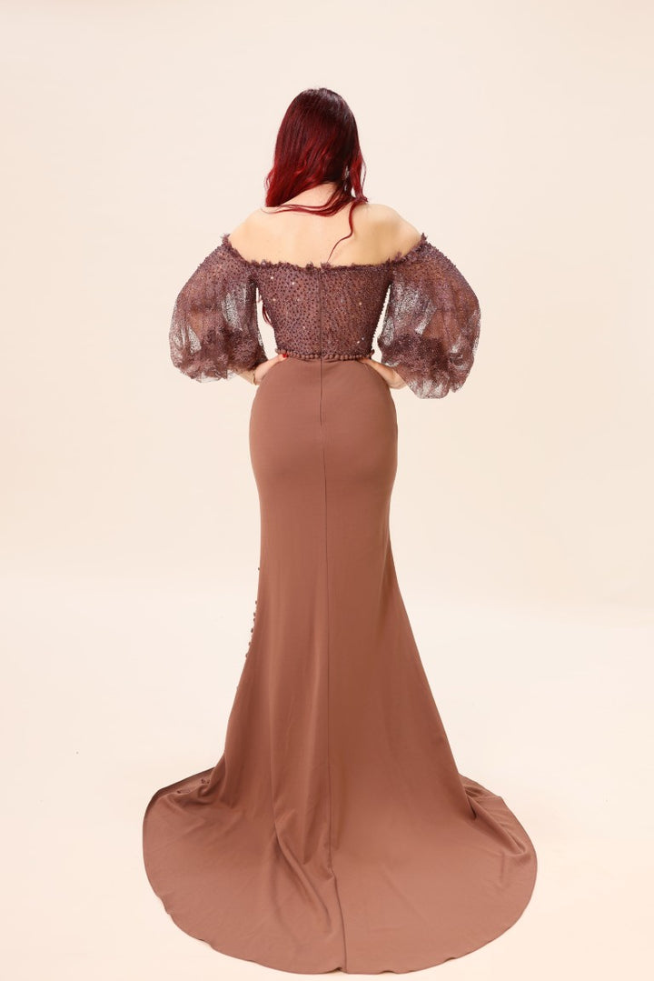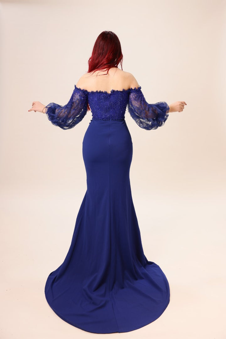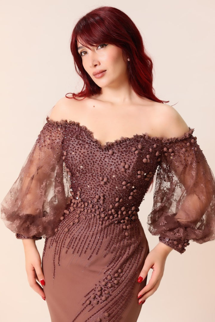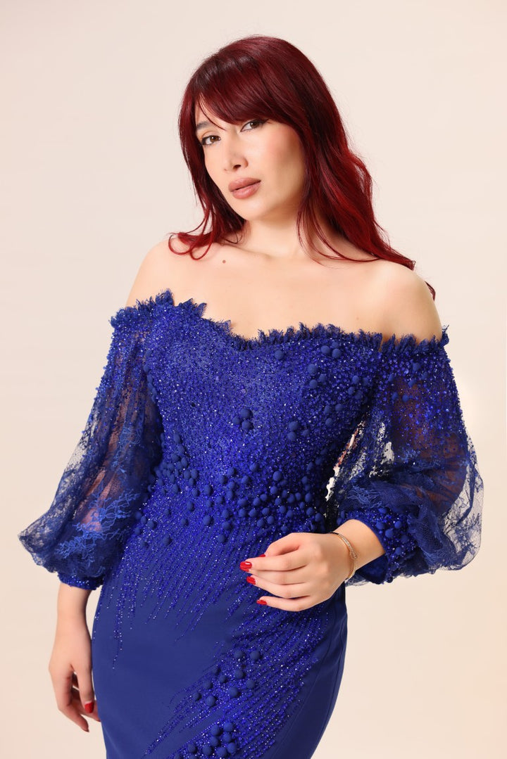 The off-shoulder neckline frames the collarbone with refined elegance, while the meticulously hand-embellished bodice and sheer voluminous sleeves evoke couture grandeur. A structured mermaid fit highlights the waist and hips before cascading into a graceful floor-length hem with a front slit — balancing poise and sensuality with perfect harmony.